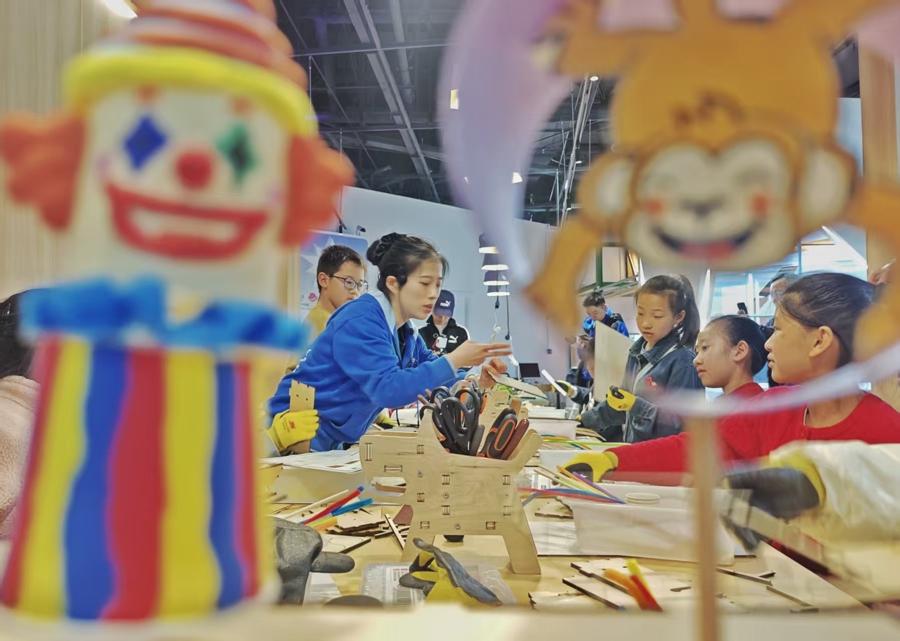 图说:在“明日科创营”空间,“创意工坊”小组在“趣玩工坊”区域制作“机巧盒”安设,体验开释创造力所带来的乐趣 照相:陶磊