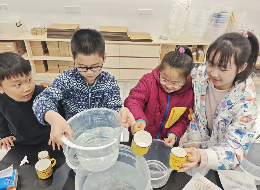 图说:在“明日科创营”空间,浮力探员”神气小组通过排水法、杠杆践诺等关节,破解“真假金冠”谜案 照相:陶磊