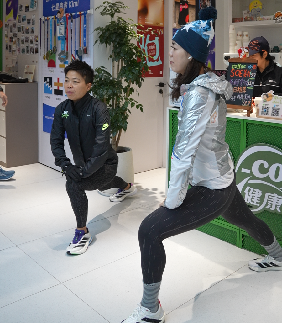 Kimi在跑步前请示跑友热身 张瑞恺 摄