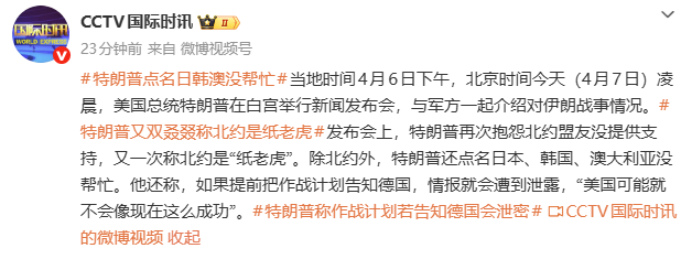 当地技术4月6日下昼,北京技术今天(4月7日)凌晨,好意思国总统特朗普在白宫举行新闻发布会,与军方沿途先容对伊朗战事情况。发布会上,特朗普再次牢骚北约盟友没提供撑合手,又一次称北约是“纸老虎”。除北约外,特朗普还点名日本、韩国、澳大利亚没赞理。他还称,要是提前把作战规划见告德国,谍报就会遭到清晰,“好意思国可能就不会像咫尺这样到手”。