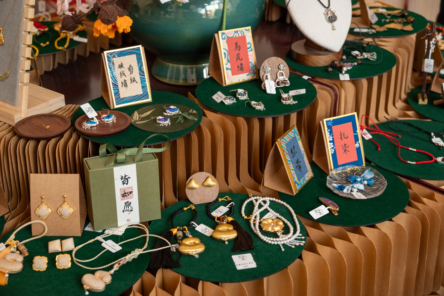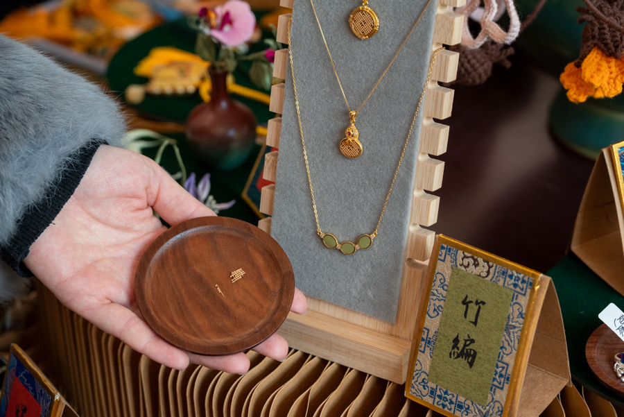 在宋锦小马的边上,挂着一只只色彩鲜艳的河北省级非遗——唐式绣球。中心一点香灰,外裹棉线,缠绕塑形,龙鳞纹、凌霄花、银锭子、樱花、玫瑰等各种花色尽显巧思。来自浙江东阳的竹丝镶嵌吊坠颇见功力——竹丝被劈至一毫米不到,刻出精细纹路后拼接成饰,即便是老师傅,也要一整天才能做出一件。