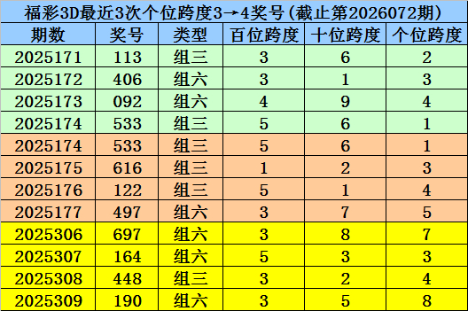第2025174-第2025176期奖号:533、616、122,其下期奖号为:497,末位号码跨度为3;