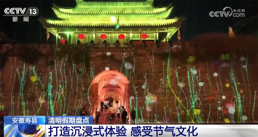夜幕来临,寿县古城墙迎来了轰动的时刻。3D投影本领将二十四气节的灵动变迁逐一投射在斑驳的城墙上,引诱了纷乱搭客前来打卡拍照。据统计,这个辉煌假期,寿县古城累计迎接搭客11万东说念主次。