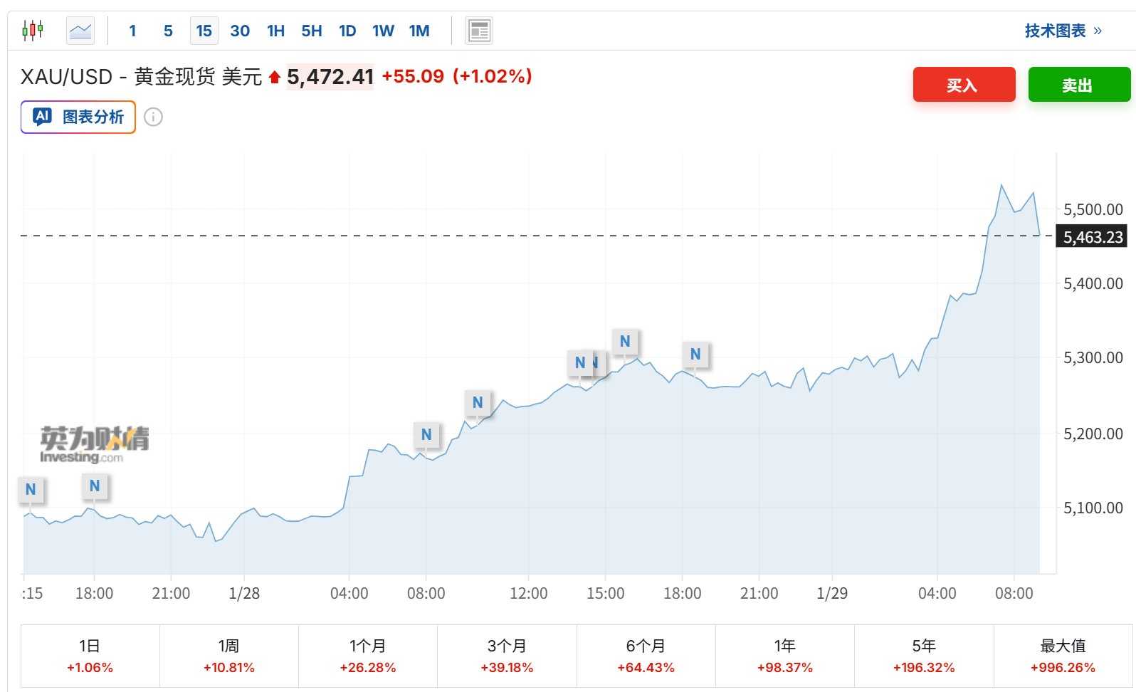 现货黄金价格在冲高逼近5600美元后出现回落,截至发稿,金价涨1.02%,报5472.41美元/盎司,刷新历史最高纪录,延续了此前因市场预期货币宽松政策、资金大规模撤离主权债券及传统货币体系所引发的强劲涨势,形成令人瞩目的持续上行态势。