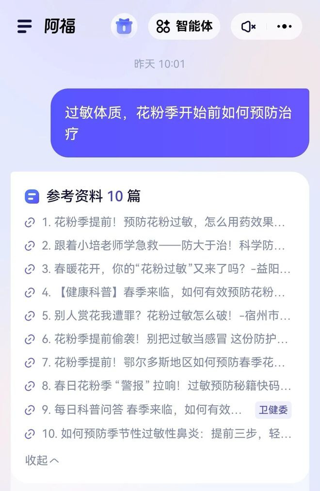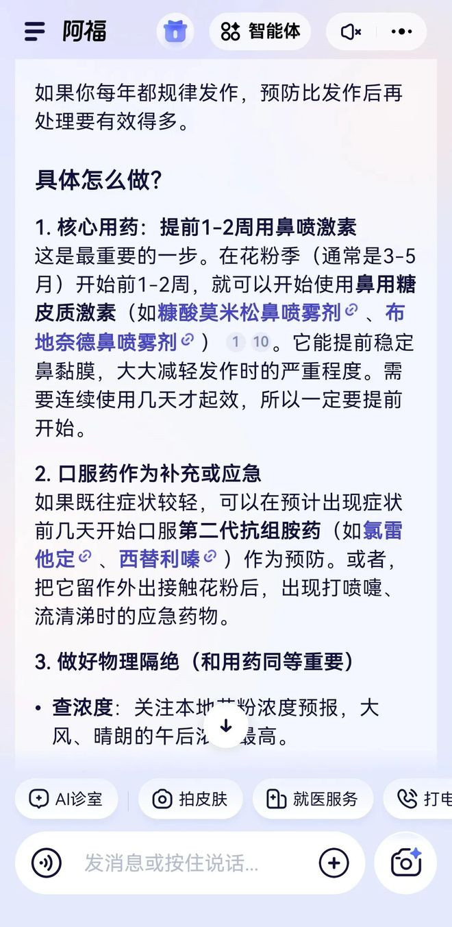 本年仍是中招了,来岁怎样防卫?刘女士用手机下载的“蚂蚁阿福”App进行了搜索。“阿福”提醒,防卫发作比发作后救助无边迫得多,“阿福”参考了10余篇官方专科著述,其中排在第一位的是“健康中国”(国度卫健委官方微信公众号)2026年3月16日刊发的《防卫花粉过敏,怎样用药恶果好?》,其中提到春季花粉过敏蚁合在3月至5月,过敏原以柏树、桦树、洋蜡树、法国梧桐等植物的花粉为主。有明确花粉过敏的患者要提前作念好打法法式。