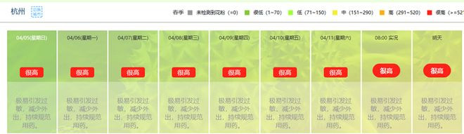 字据中国天气网数据,国际期货配资杭州花粉过敏风险最近一直处于高位,意味着春季花粉季已投入高风险阶段,极易激励过敏。