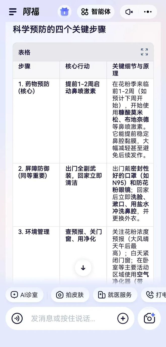 生计中怎样削弱过敏症状?“阿福”贴心给出提倡,比如外出前要查花粉预告,戴好M95防护口罩和护目镜,穿光滑面料外衣(减少花粉附着)。回家后立即扩充“三部曲”:换外衣、洗脸漱口、用生理盐水冲洗鼻腔,把吸附在一稔和肉体名义的过敏原去除。居家工夫尽量不开门窗,使用带HEPA滤网的空气净化器等。这些提醒正好亦然“健康中国”人人思提醒“过敏星东说念主”的。