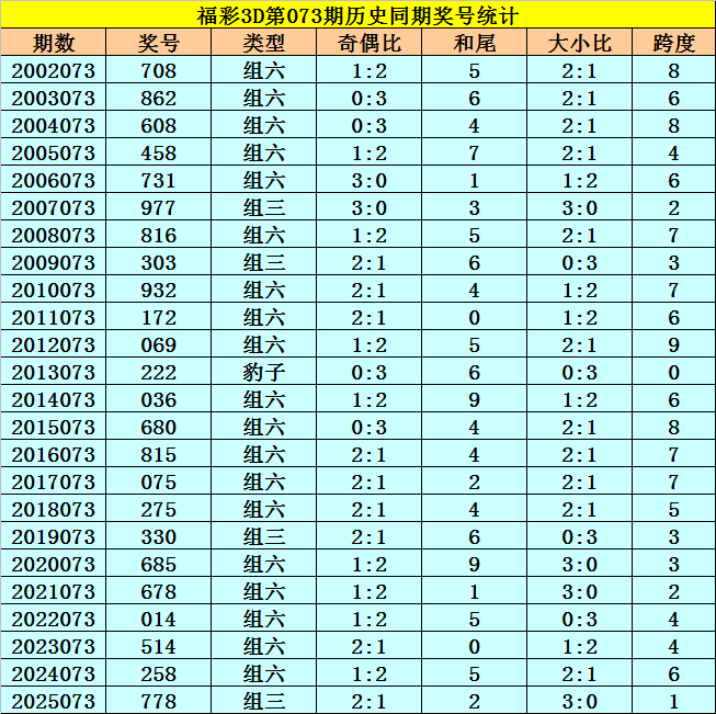 福彩3D积年第073期同时奖号为:708 862 608 458 731 977 816 303 932 172 069 222 036 680 815 075 275 330 685 678 014 514 258 778。