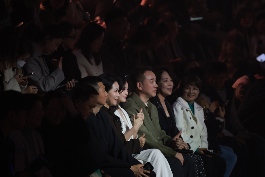 荷比俪品牌代言东说念主李一桐(一滑中间身着白色服装)现身秀场。海沙尔摄